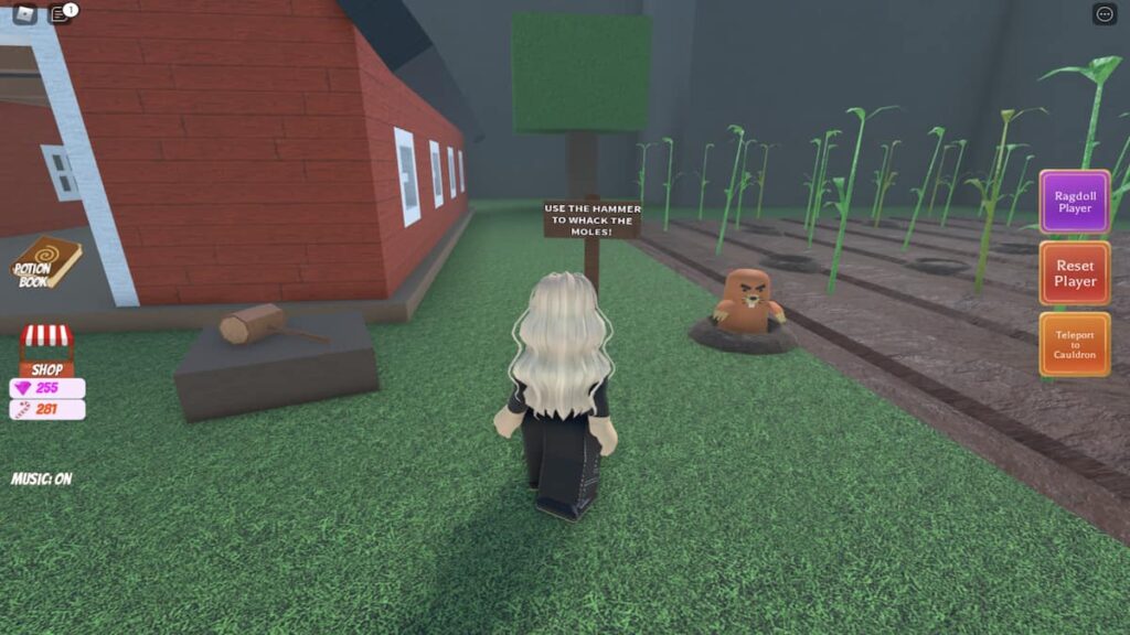 Ahora que has llegado a la granja, toma el gran mazo de madera que está sobre la roca cuadrada y acércate al topo de aspecto enojado que está junto a él. Para comenzar el minijuego, sigue las instrucciones escritas en el letrero Usa el martillo para golpear a los topos : ¡aplasta al topo enojado con tu nuevo martillo! Después de hacerlo, debería ver aparecer un temporizador en la parte superior de la pantalla, junto con un contador que le indica cuántos lunares ha golpeado .